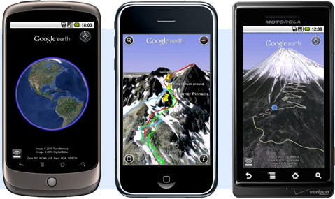 Now Google Earth is available for android. Using it you can explore the world in your plam. Its features are Exploring in 3D, Local Search, My Location, Search by voice, Multi Touch, Layers. Not all the phone running android have a Google Earth supports. Phones having android 2.1+ version of android are supported.