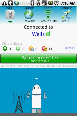 WeFi is an app which automatically finds and cconnects to the wi-fi spot near you. It also have its own Wi-Fi network around the world to access internet from anywhere. It has an inbuilt IM for your Buddy list. If you are frustrated searching for a Wi-Fi connectivity around you try this for free Wi-Fi connectivity.